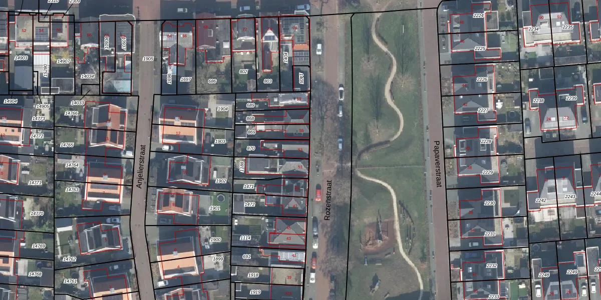 Het perceel waarop Rozenstraat 53 staat heeft een oppervlakte van 157 m². Dit is een middelgroot perceel. De perceeloppervlakte wordt geregistreerd door het Kadaster. Gedetailleerde informatie over de maten van dit perceel kunt u vinden in het rapport Kadastrale kaart met maatvoering van Rozenstraat 53.