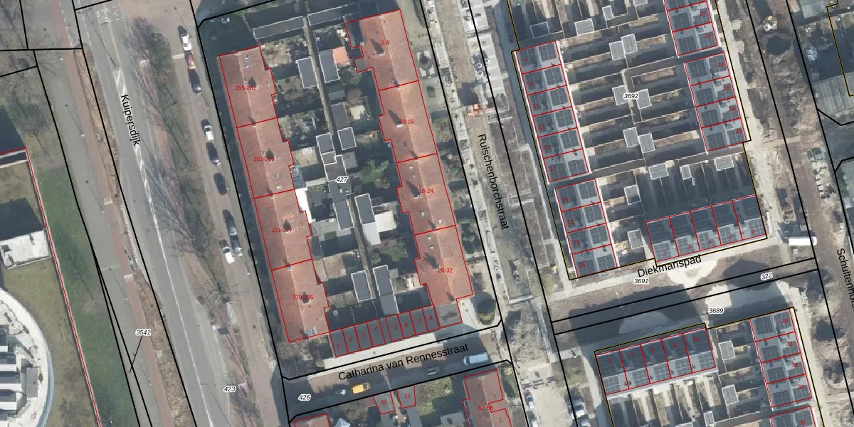 Het perceel waarop Ruischenborchstraat 24 staat heeft een oppervlakte van 4590 m². Dit is een zeer groot perceel. De perceeloppervlakte wordt geregistreerd door het Kadaster. Gedetailleerde informatie over de maten van dit perceel kunt u vinden in het rapport Kadastrale kaart met maatvoering van Ruischenborchstraat 24.
