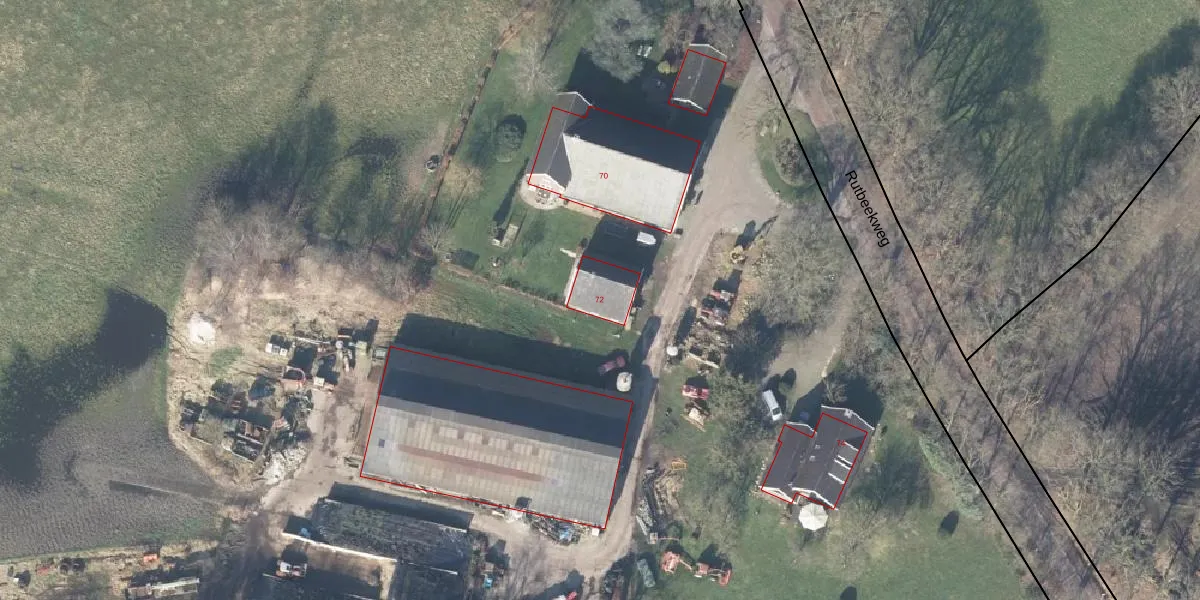 Het perceel waarop Rutbeekweg 72 staat heeft een oppervlakte van 6,2 ha. Dit is een zeer groot perceel. De perceeloppervlakte wordt geregistreerd door het Kadaster. Gedetailleerde informatie over de maten van dit perceel kunt u vinden in het rapport Kadastrale kaart met maatvoering van Rutbeekweg 72.