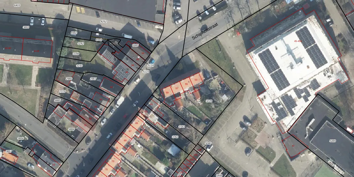 Het perceel waarop Schipholtstraat 57 staat heeft een oppervlakte van 1334 m². Dit is een zeer groot perceel. De perceeloppervlakte wordt geregistreerd door het Kadaster. Gedetailleerde informatie over de maten van dit perceel kunt u vinden in het rapport Kadastrale kaart met maatvoering van Schipholtstraat 57.