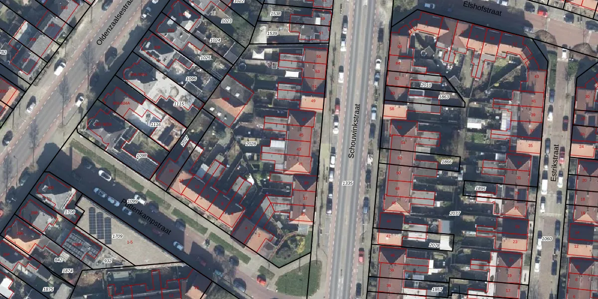 Het perceel waarop Schouwinkstraat 43 staat heeft een oppervlakte van 2660 m². Dit is een zeer groot perceel. De perceeloppervlakte wordt geregistreerd door het Kadaster. Gedetailleerde informatie over de maten van dit perceel kunt u vinden in het rapport Kadastrale kaart met maatvoering van Schouwinkstraat 43.