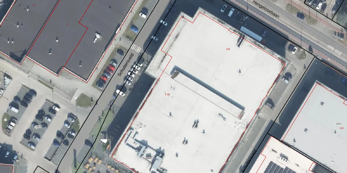 Het perceel waarop Schuttersveld 1-B staat heeft een oppervlakte van 1,1 ha. Dit is een zeer groot perceel. De perceeloppervlakte wordt geregistreerd door het Kadaster. Gedetailleerde informatie over de maten van dit perceel kunt u vinden in het rapport Kadastrale kaart met maatvoering van Schuttersveld 1-B.