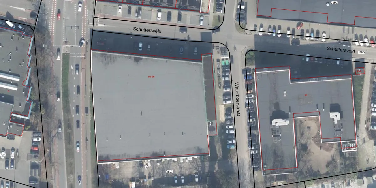 Het perceel waarop Schuttersveld 56 staat heeft een oppervlakte van 6276 m². Dit is een zeer groot perceel. De perceeloppervlakte wordt geregistreerd door het Kadaster. Gedetailleerde informatie over de maten van dit perceel kunt u vinden in het rapport Kadastrale kaart met maatvoering van Schuttersveld 56.