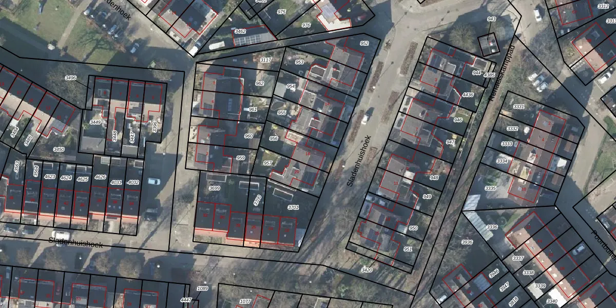 Sladenhuishoek 18 is gelegen op kadastraal perceel LNK00U956. Deze kadastrale aanduiding is uniek en wordt gebruikt door het Kadaster om eigendomsrechten en andere zakelijke rechten vast te leggen. Het perceel maakt onderdeel uit van de kadastrale gemeente Lonneker.