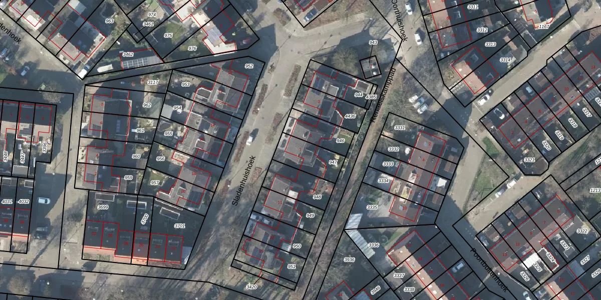 Sladenhuishoek 7 is gelegen op kadastraal perceel LNK00U947. Deze kadastrale aanduiding is uniek en wordt gebruikt door het Kadaster om eigendomsrechten en andere zakelijke rechten vast te leggen. Het perceel maakt onderdeel uit van de kadastrale gemeente Lonneker.