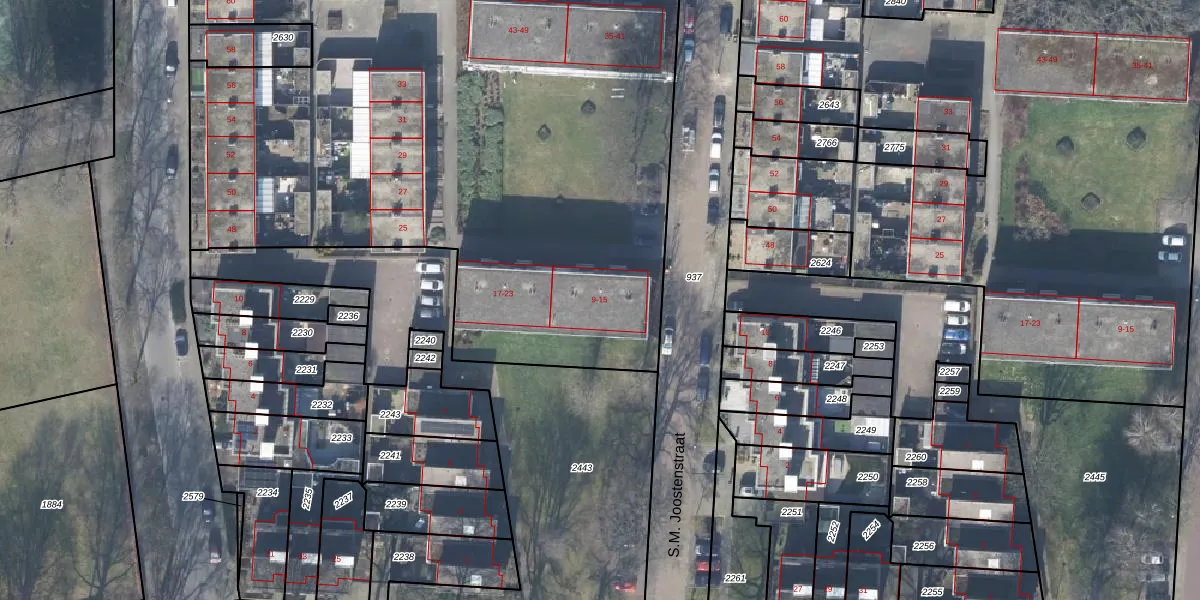 Het perceel waarop S.M. Joostenstraat 13 staat heeft een oppervlakte van 9753 m². Dit is een zeer groot perceel. De perceeloppervlakte wordt geregistreerd door het Kadaster. Gedetailleerde informatie over de maten van dit perceel kunt u vinden in het rapport Kadastrale kaart met maatvoering van S.M. Joostenstraat 13.