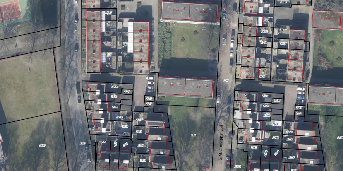 Het perceel waarop S.M. Joostenstraat 17-A staat heeft een oppervlakte van 9753 m². Dit is een zeer groot perceel. De perceeloppervlakte wordt geregistreerd door het Kadaster. Gedetailleerde informatie over de maten van dit perceel kunt u vinden in het rapport Kadastrale kaart met maatvoering van S.M. Joostenstraat 17-A.