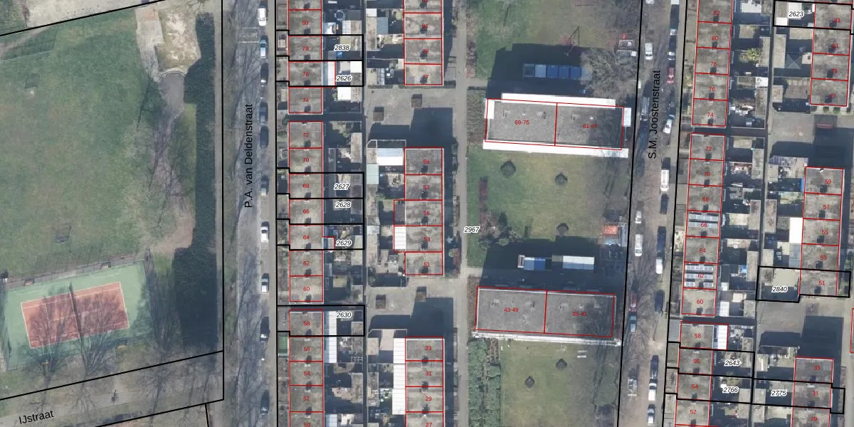 Het perceel waarop S.M. Joostenstraat 55 staat heeft een oppervlakte van 9753 m². Dit is een zeer groot perceel. De perceeloppervlakte wordt geregistreerd door het Kadaster. Gedetailleerde informatie over de maten van dit perceel kunt u vinden in het rapport Kadastrale kaart met maatvoering van S.M. Joostenstraat 55.