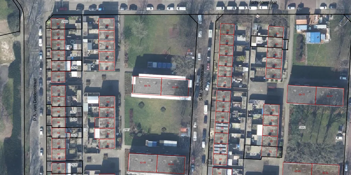 Het perceel waarop S.M. Joostenstraat 61-A staat heeft een oppervlakte van 9753 m². Dit is een zeer groot perceel. De perceeloppervlakte wordt geregistreerd door het Kadaster. Gedetailleerde informatie over de maten van dit perceel kunt u vinden in het rapport Kadastrale kaart met maatvoering van S.M. Joostenstraat 61-A.