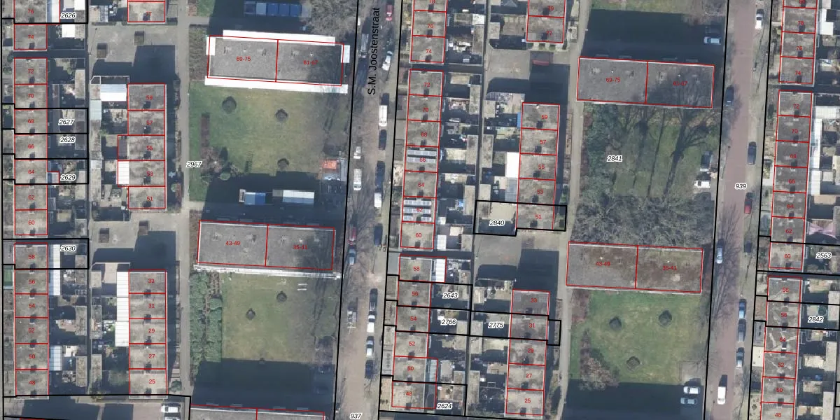 Het perceel waarop S.M. Joostenstraat 62 staat heeft een oppervlakte van 9703 m². Dit is een zeer groot perceel. De perceeloppervlakte wordt geregistreerd door het Kadaster. Gedetailleerde informatie over de maten van dit perceel kunt u vinden in het rapport Kadastrale kaart met maatvoering van S.M. Joostenstraat 62.