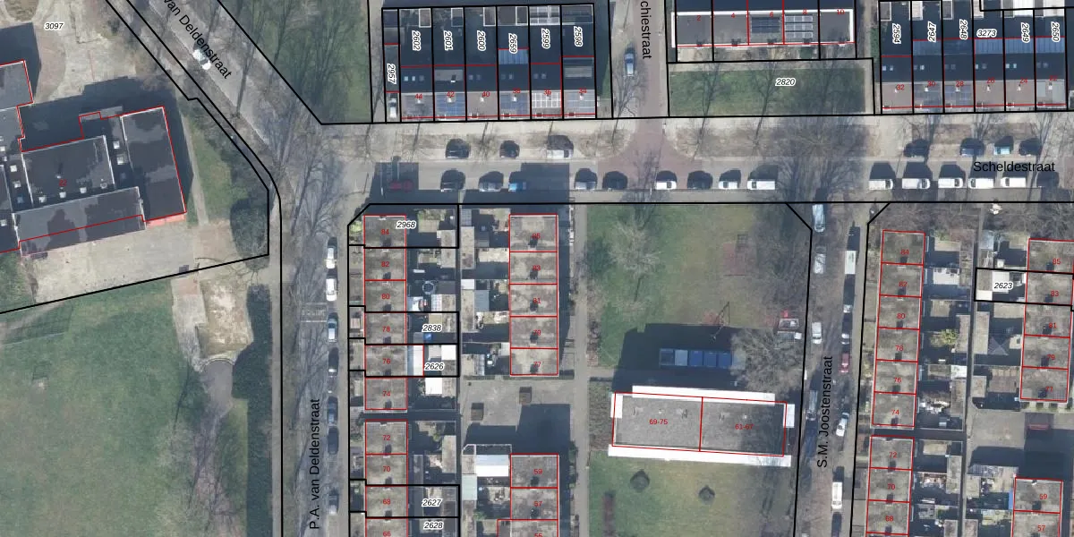 Het perceel waarop S.M. Joostenstraat 83 staat heeft een oppervlakte van 9753 m². Dit is een zeer groot perceel. De perceeloppervlakte wordt geregistreerd door het Kadaster. Gedetailleerde informatie over de maten van dit perceel kunt u vinden in het rapport Kadastrale kaart met maatvoering van S.M. Joostenstraat 83.