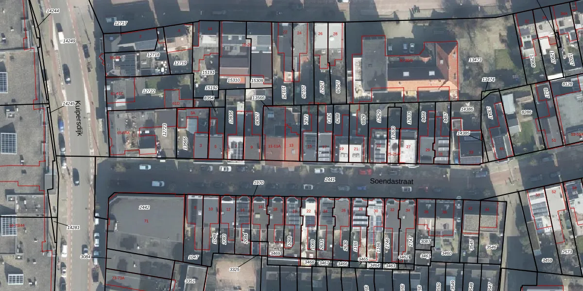 Het perceel waarop Soendastraat 13 staat heeft een oppervlakte van 250 m². Dit is een middelgroot perceel. De perceeloppervlakte wordt geregistreerd door het Kadaster. Gedetailleerde informatie over de maten van dit perceel kunt u vinden in het rapport Kadastrale kaart met maatvoering van Soendastraat 13.