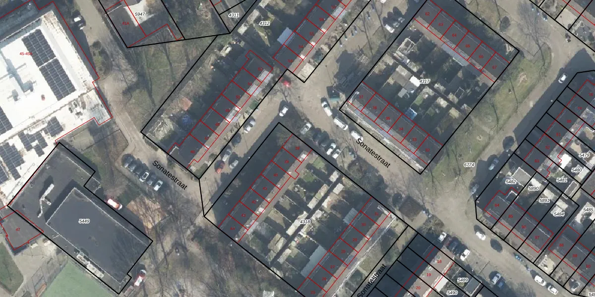 Het perceel waarop Sonatestraat 38 staat heeft een oppervlakte van 2246 m². Dit is een zeer groot perceel. De perceeloppervlakte wordt geregistreerd door het Kadaster. Gedetailleerde informatie over de maten van dit perceel kunt u vinden in het rapport Kadastrale kaart met maatvoering van Sonatestraat 38.