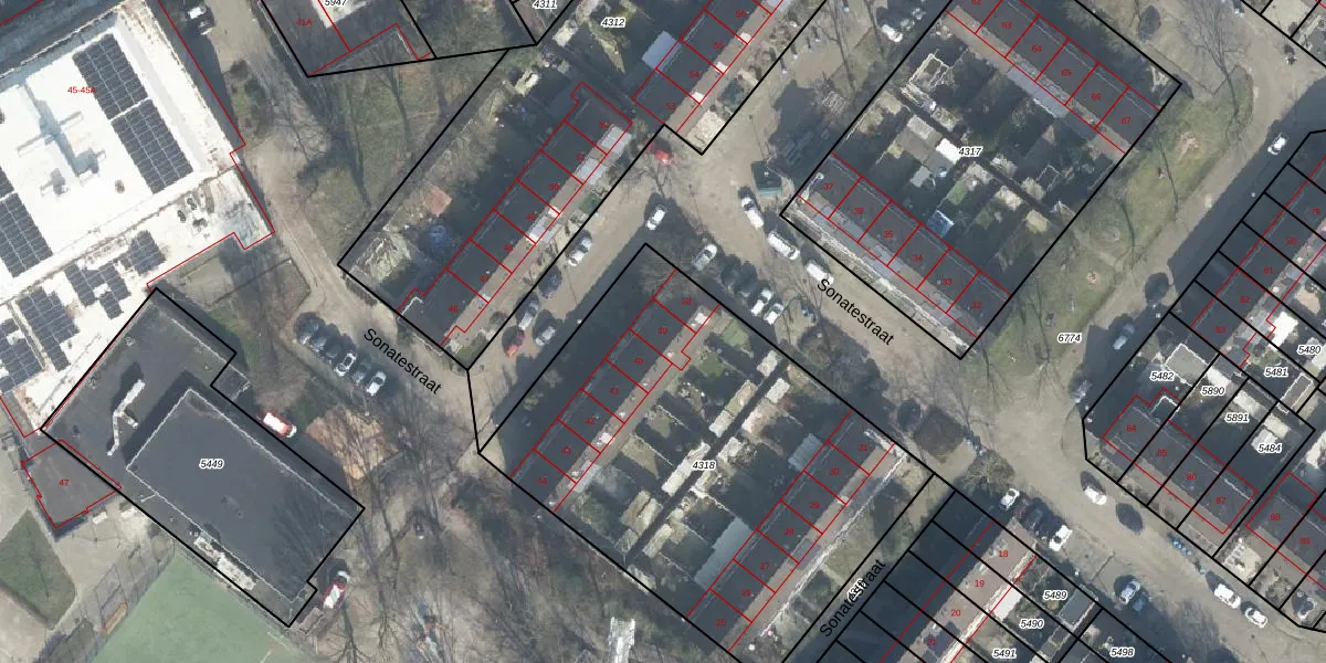 Het perceel waarop Sonatestraat 39 staat heeft een oppervlakte van 2246 m². Dit is een zeer groot perceel. De perceeloppervlakte wordt geregistreerd door het Kadaster. Gedetailleerde informatie over de maten van dit perceel kunt u vinden in het rapport Kadastrale kaart met maatvoering van Sonatestraat 39.