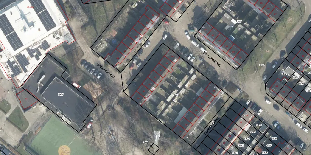 Het perceel waarop Sonatestraat 41 staat heeft een oppervlakte van 2246 m². Dit is een zeer groot perceel. De perceeloppervlakte wordt geregistreerd door het Kadaster. Gedetailleerde informatie over de maten van dit perceel kunt u vinden in het rapport Kadastrale kaart met maatvoering van Sonatestraat 41.