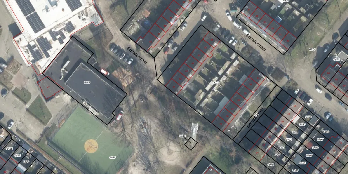 Het perceel waarop Sonatestraat 44 staat heeft een oppervlakte van 2246 m². Dit is een zeer groot perceel. De perceeloppervlakte wordt geregistreerd door het Kadaster. Gedetailleerde informatie over de maten van dit perceel kunt u vinden in het rapport Kadastrale kaart met maatvoering van Sonatestraat 44.