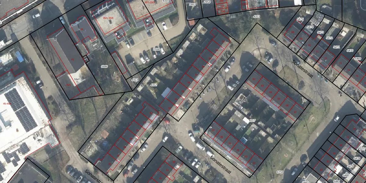 Het perceel waarop Sonatestraat 55 staat heeft een oppervlakte van 2669 m². Dit is een zeer groot perceel. De perceeloppervlakte wordt geregistreerd door het Kadaster. Gedetailleerde informatie over de maten van dit perceel kunt u vinden in het rapport Kadastrale kaart met maatvoering van Sonatestraat 55.