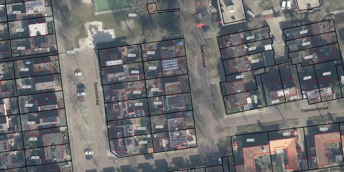 Het perceel waarop Spartastraat 34 staat heeft een oppervlakte van 262 m². Dit is een middelgroot perceel. De perceeloppervlakte wordt geregistreerd door het Kadaster. Gedetailleerde informatie over de maten van dit perceel kunt u vinden in het rapport Kadastrale kaart met maatvoering van Spartastraat 34.