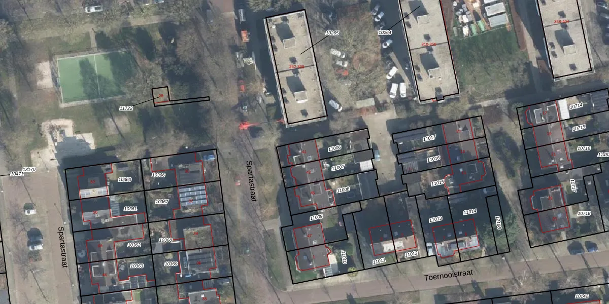 Het perceel waarop Spartastraat 41 staat heeft een oppervlakte van 210 m². Dit is een middelgroot perceel. De perceeloppervlakte wordt geregistreerd door het Kadaster. Gedetailleerde informatie over de maten van dit perceel kunt u vinden in het rapport Kadastrale kaart met maatvoering van Spartastraat 41.