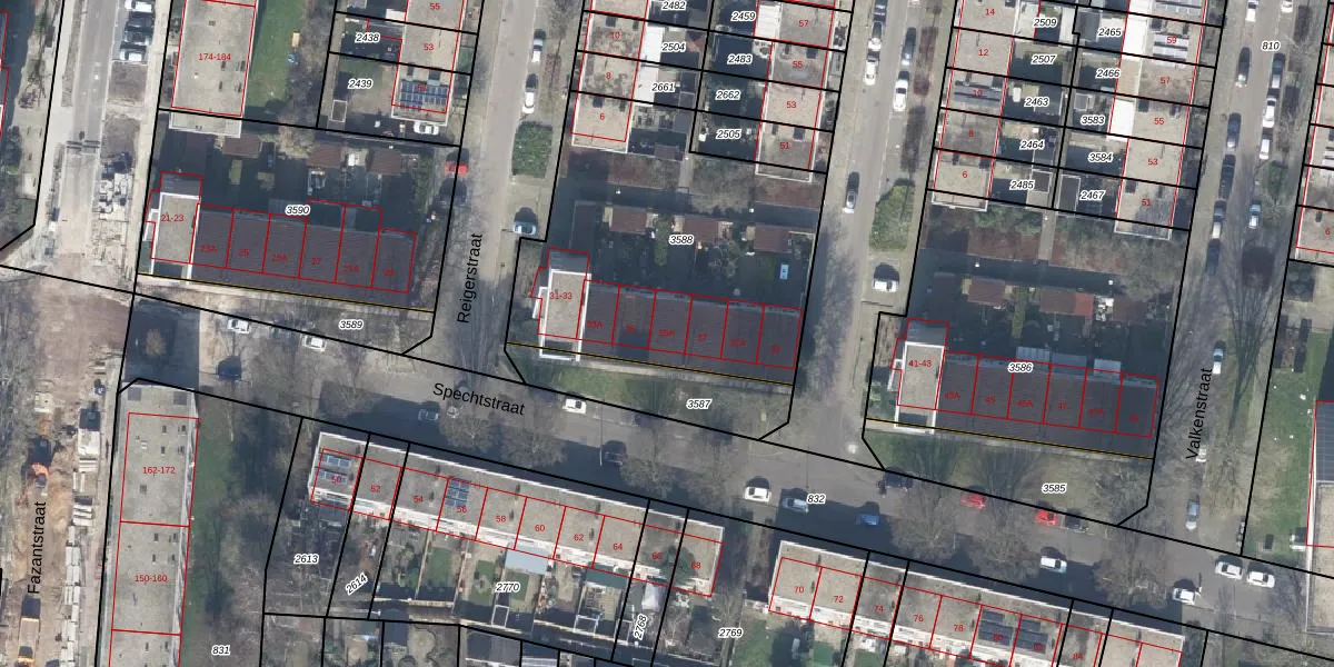 Het perceel waarop Spechtstraat 35-A staat heeft een oppervlakte van 1479 m². Dit is een zeer groot perceel. De perceeloppervlakte wordt geregistreerd door het Kadaster. Gedetailleerde informatie over de maten van dit perceel kunt u vinden in het rapport Kadastrale kaart met maatvoering van Spechtstraat 35-A.