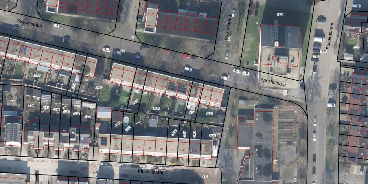 Het perceel waarop Spechtstraat 82 staat heeft een oppervlakte van 1106 m². Dit is een zeer groot perceel. De perceeloppervlakte wordt geregistreerd door het Kadaster. Gedetailleerde informatie over de maten van dit perceel kunt u vinden in het rapport Kadastrale kaart met maatvoering van Spechtstraat 82.