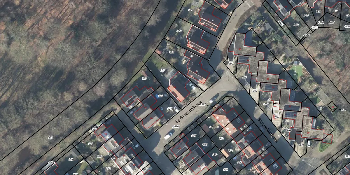Het perceel waarop Springendalhoek 66 staat heeft een oppervlakte van 449 m². Dit is een groot perceel. De perceeloppervlakte wordt geregistreerd door het Kadaster. Gedetailleerde informatie over de maten van dit perceel kunt u vinden in het rapport Kadastrale kaart met maatvoering van Springendalhoek 66.