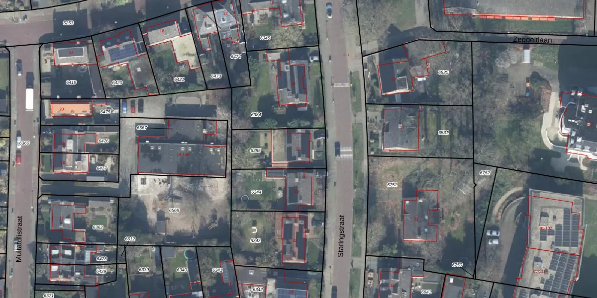 Het perceel waarop Staringstraat 22 staat heeft een oppervlakte van 426 m². Dit is een groot perceel. De perceeloppervlakte wordt geregistreerd door het Kadaster. Gedetailleerde informatie over de maten van dit perceel kunt u vinden in het rapport Kadastrale kaart met maatvoering van Staringstraat 22.