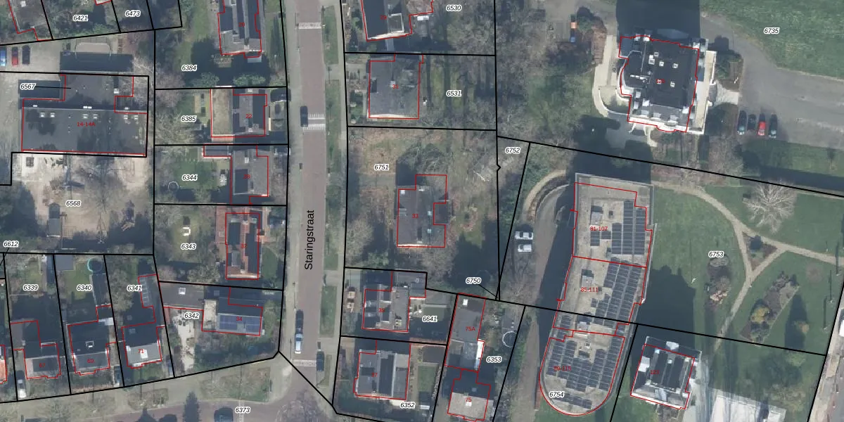 Het perceel waarop Staringstraat 33 staat heeft een oppervlakte van 1297 m². Dit is een zeer groot perceel. De perceeloppervlakte wordt geregistreerd door het Kadaster. Gedetailleerde informatie over de maten van dit perceel kunt u vinden in het rapport Kadastrale kaart met maatvoering van Staringstraat 33.