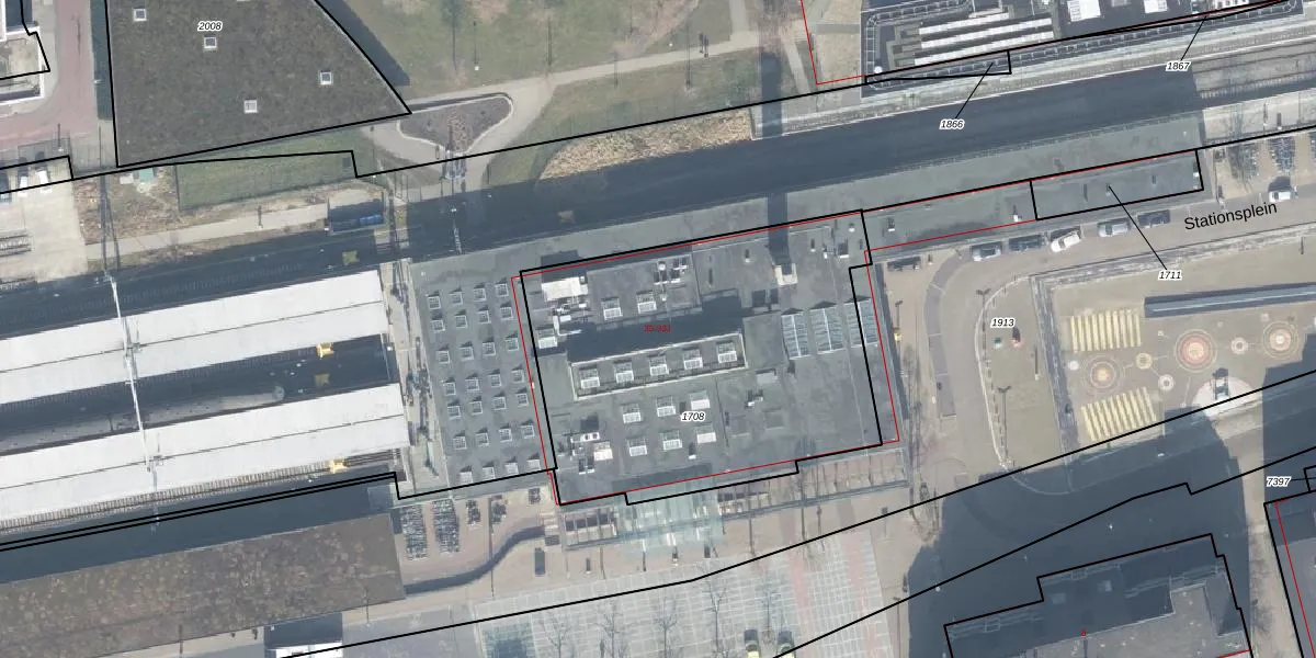 Het perceel waarop Stationsplein 33-F staat heeft een oppervlakte van 1835 m². Dit is een zeer groot perceel. De perceeloppervlakte wordt geregistreerd door het Kadaster. Gedetailleerde informatie over de maten van dit perceel kunt u vinden in het rapport Kadastrale kaart met maatvoering van Stationsplein 33-F.