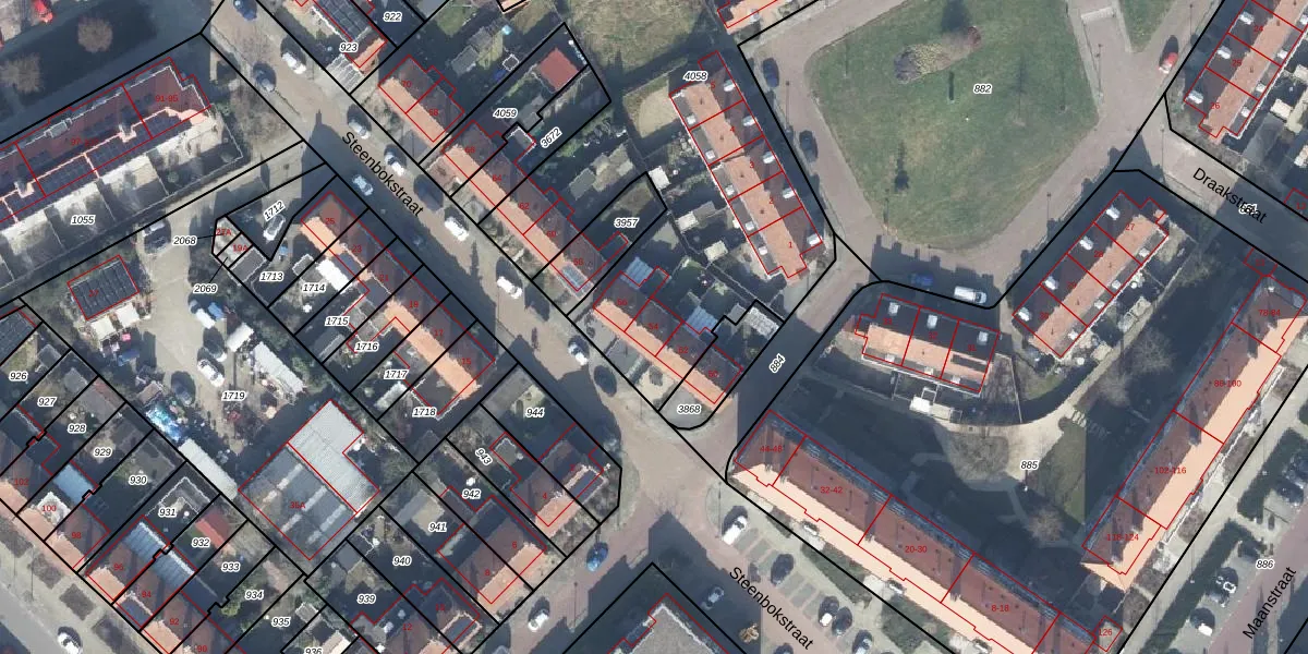 Het perceel waarop Steenbokstraat 54 staat heeft een oppervlakte van 3452 m². Dit is een zeer groot perceel. De perceeloppervlakte wordt geregistreerd door het Kadaster. Gedetailleerde informatie over de maten van dit perceel kunt u vinden in het rapport Kadastrale kaart met maatvoering van Steenbokstraat 54.
