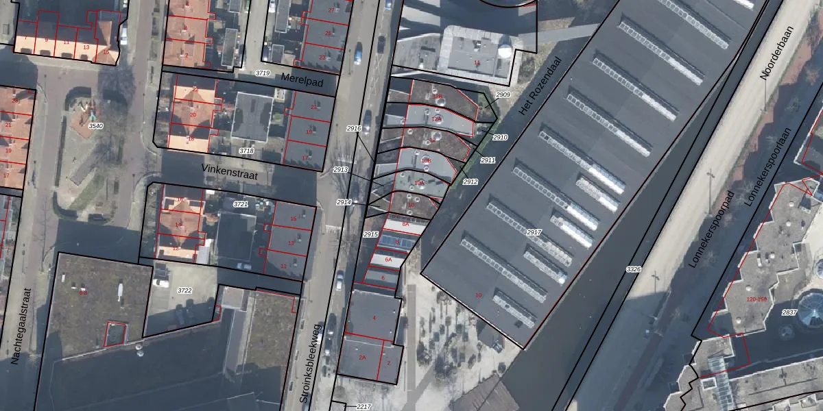 Gebruik de zoekbalk of klik op een perceel voor informatie over de adressen binnen dit perceel.