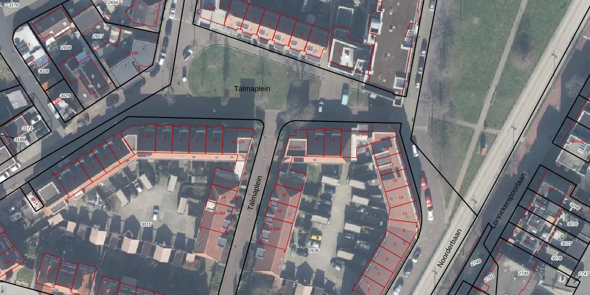 Het perceel waarop Talmaplein 24-A staat heeft een oppervlakte van 3979 m². Dit is een zeer groot perceel. De perceeloppervlakte wordt geregistreerd door het Kadaster. Gedetailleerde informatie over de maten van dit perceel kunt u vinden in het rapport Kadastrale kaart met maatvoering van Talmaplein 24-A.