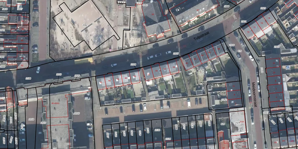 Het perceel waarop Tulpstraat 52 staat heeft een oppervlakte van 2295 m². Dit is een zeer groot perceel. De perceeloppervlakte wordt geregistreerd door het Kadaster. Gedetailleerde informatie over de maten van dit perceel kunt u vinden in het rapport Kadastrale kaart met maatvoering van Tulpstraat 52.