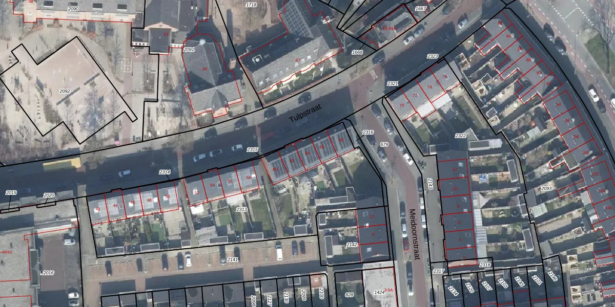 Het perceel waarop Tulpstraat 64 staat heeft een oppervlakte van 2295 m². Dit is een zeer groot perceel. De perceeloppervlakte wordt geregistreerd door het Kadaster. Gedetailleerde informatie over de maten van dit perceel kunt u vinden in het rapport Kadastrale kaart met maatvoering van Tulpstraat 64.