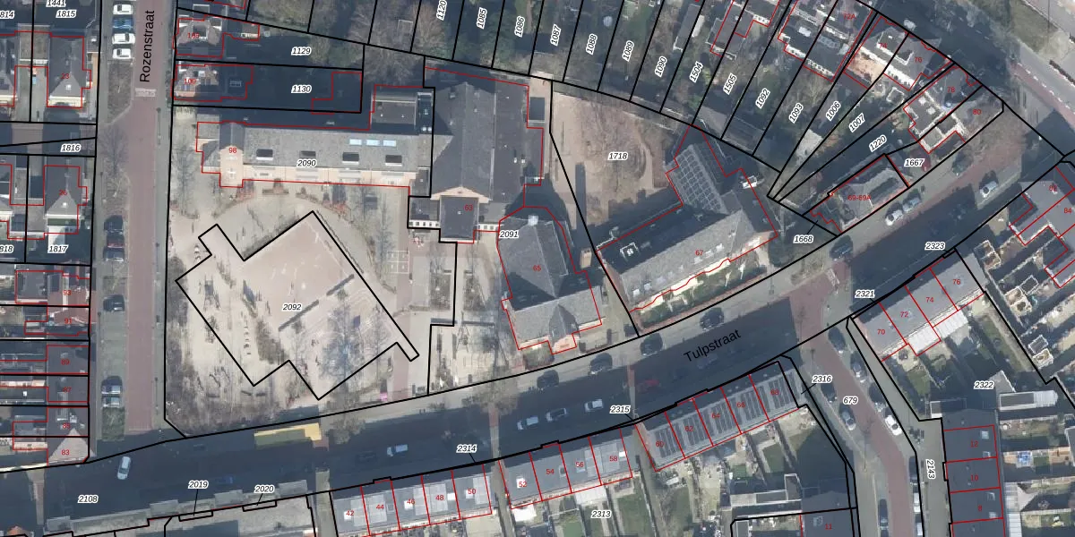 Het perceel waarop Tulpstraat 65 staat heeft een oppervlakte van 1600 m². Dit is een zeer groot perceel. De perceeloppervlakte wordt geregistreerd door het Kadaster. Gedetailleerde informatie over de maten van dit perceel kunt u vinden in het rapport Kadastrale kaart met maatvoering van Tulpstraat 65.