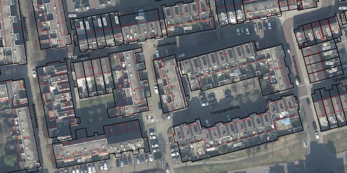 Het perceel waarop Tusveldburg 24 staat heeft een oppervlakte van 439 m². Dit is een groot perceel. De perceeloppervlakte wordt geregistreerd door het Kadaster. Gedetailleerde informatie over de maten van dit perceel kunt u vinden in het rapport Kadastrale kaart met maatvoering van Tusveldburg 24.