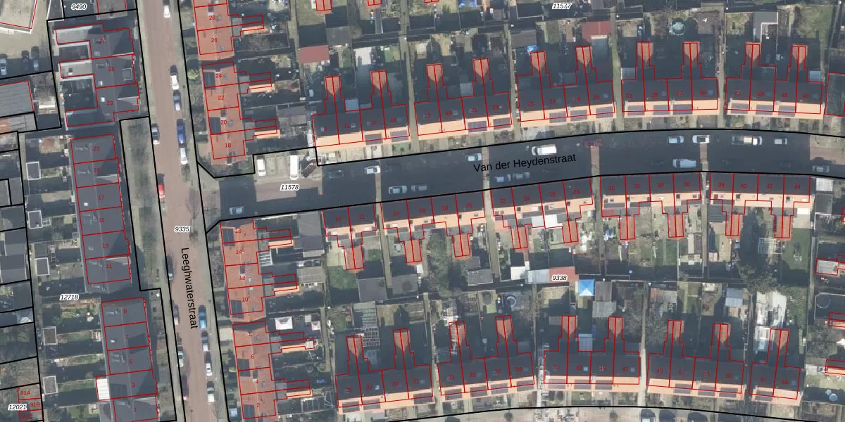 Het perceel waarop Van der Heydenstraat 16 staat heeft een oppervlakte van 9019 m². Dit is een zeer groot perceel. De perceeloppervlakte wordt geregistreerd door het Kadaster. Gedetailleerde informatie over de maten van dit perceel kunt u vinden in het rapport Kadastrale kaart met maatvoering van Van der Heydenstraat 16.