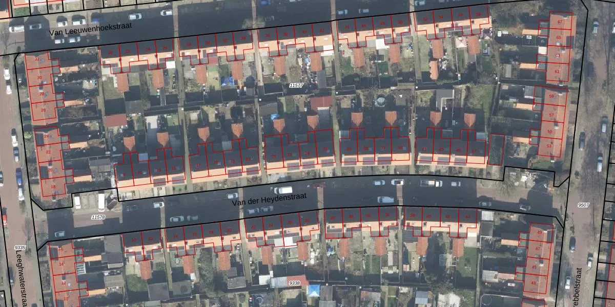 Het perceel waarop Van der Heydenstraat 29 staat heeft een oppervlakte van 9467 m². Dit is een zeer groot perceel. De perceeloppervlakte wordt geregistreerd door het Kadaster. Gedetailleerde informatie over de maten van dit perceel kunt u vinden in het rapport Kadastrale kaart met maatvoering van Van der Heydenstraat 29.