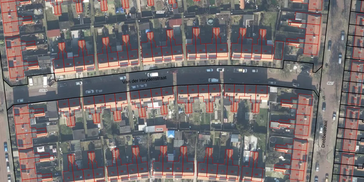 Het perceel waarop Van der Heydenstraat 30 staat heeft een oppervlakte van 9019 m². Dit is een zeer groot perceel. De perceeloppervlakte wordt geregistreerd door het Kadaster. Gedetailleerde informatie over de maten van dit perceel kunt u vinden in het rapport Kadastrale kaart met maatvoering van Van der Heydenstraat 30.