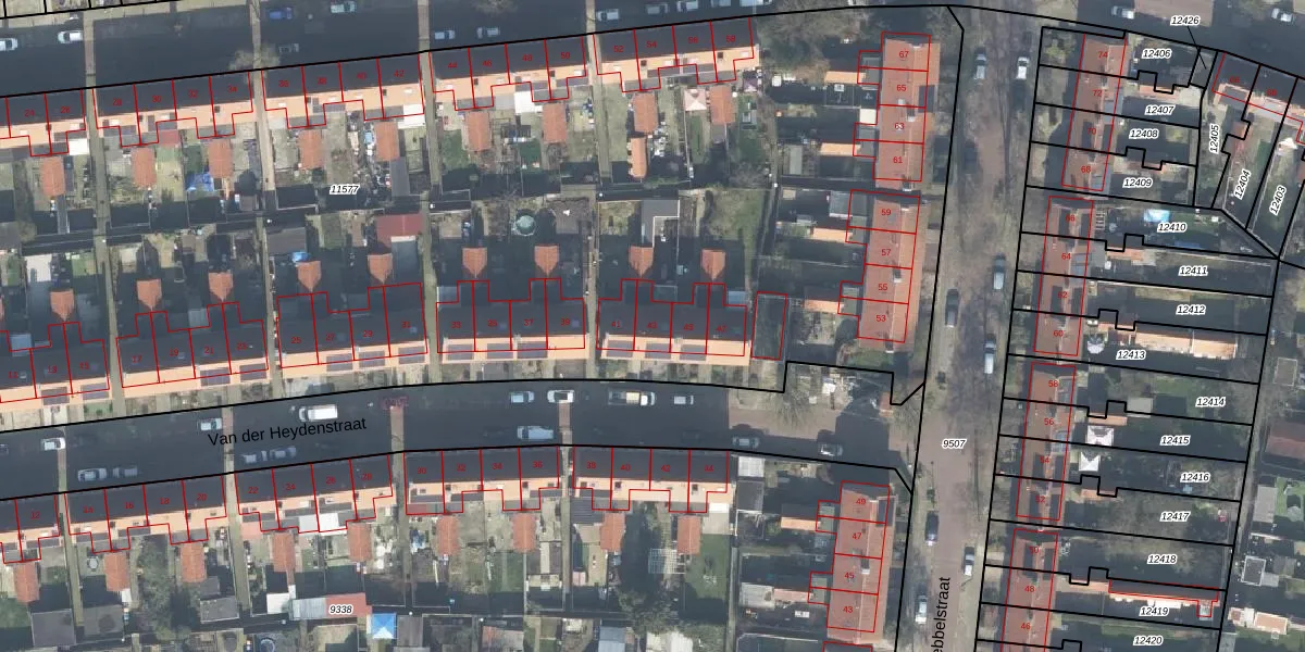 Het perceel waarop Van der Heydenstraat 43 staat heeft een oppervlakte van 9467 m². Dit is een zeer groot perceel. De perceeloppervlakte wordt geregistreerd door het Kadaster. Gedetailleerde informatie over de maten van dit perceel kunt u vinden in het rapport Kadastrale kaart met maatvoering van Van der Heydenstraat 43.