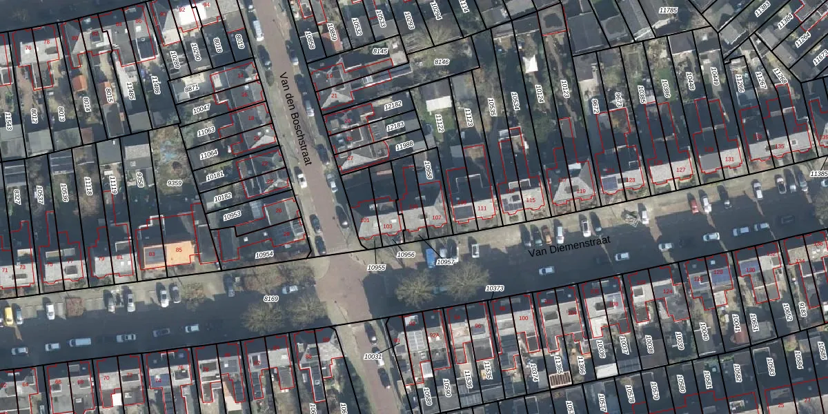 Het perceel waarop Van Diemenstraat 105 staat heeft een oppervlakte van 115 m². Dit is een middelgroot perceel. De perceeloppervlakte wordt geregistreerd door het Kadaster. Gedetailleerde informatie over de maten van dit perceel kunt u vinden in het rapport Kadastrale kaart met maatvoering van Van Diemenstraat 105.
