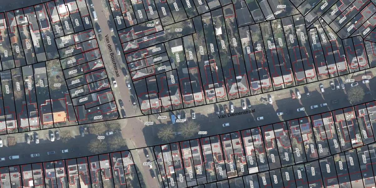 Het perceel waarop Van Diemenstraat 109 staat heeft een oppervlakte van 278 m². Dit is een middelgroot perceel. De perceeloppervlakte wordt geregistreerd door het Kadaster. Gedetailleerde informatie over de maten van dit perceel kunt u vinden in het rapport Kadastrale kaart met maatvoering van Van Diemenstraat 109.