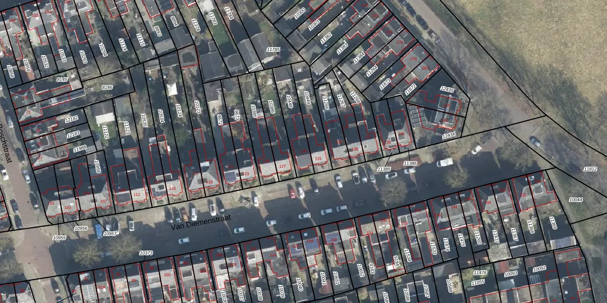 Het perceel waarop Van Diemenstraat 129 staat heeft een oppervlakte van 223 m². Dit is een middelgroot perceel. De perceeloppervlakte wordt geregistreerd door het Kadaster. Gedetailleerde informatie over de maten van dit perceel kunt u vinden in het rapport Kadastrale kaart met maatvoering van Van Diemenstraat 129.