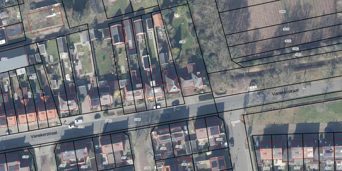 Het perceel waarop Vanekerstraat 274 staat heeft een oppervlakte van 444 m². Dit is een groot perceel. De perceeloppervlakte wordt geregistreerd door het Kadaster. Gedetailleerde informatie over de maten van dit perceel kunt u vinden in het rapport Kadastrale kaart met maatvoering van Vanekerstraat 274.