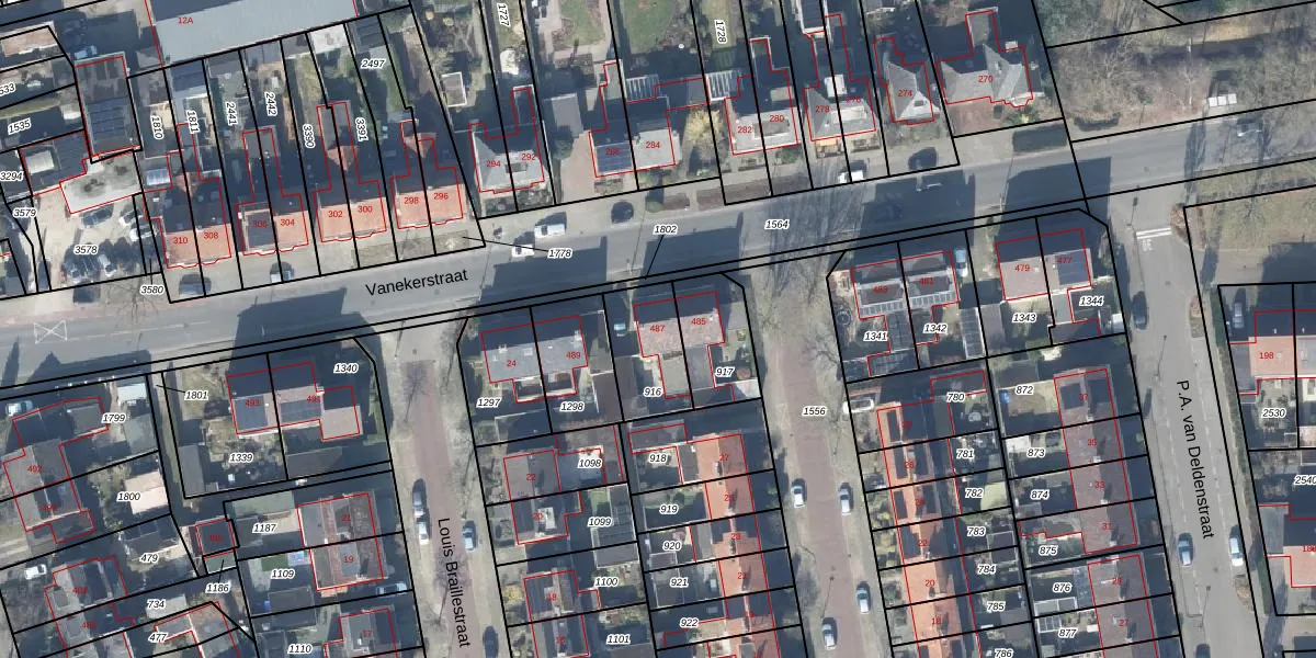 Het perceel waarop Vanekerstraat 487 staat heeft een oppervlakte van 213 m². Dit is een middelgroot perceel. De perceeloppervlakte wordt geregistreerd door het Kadaster. Gedetailleerde informatie over de maten van dit perceel kunt u vinden in het rapport Kadastrale kaart met maatvoering van Vanekerstraat 487.