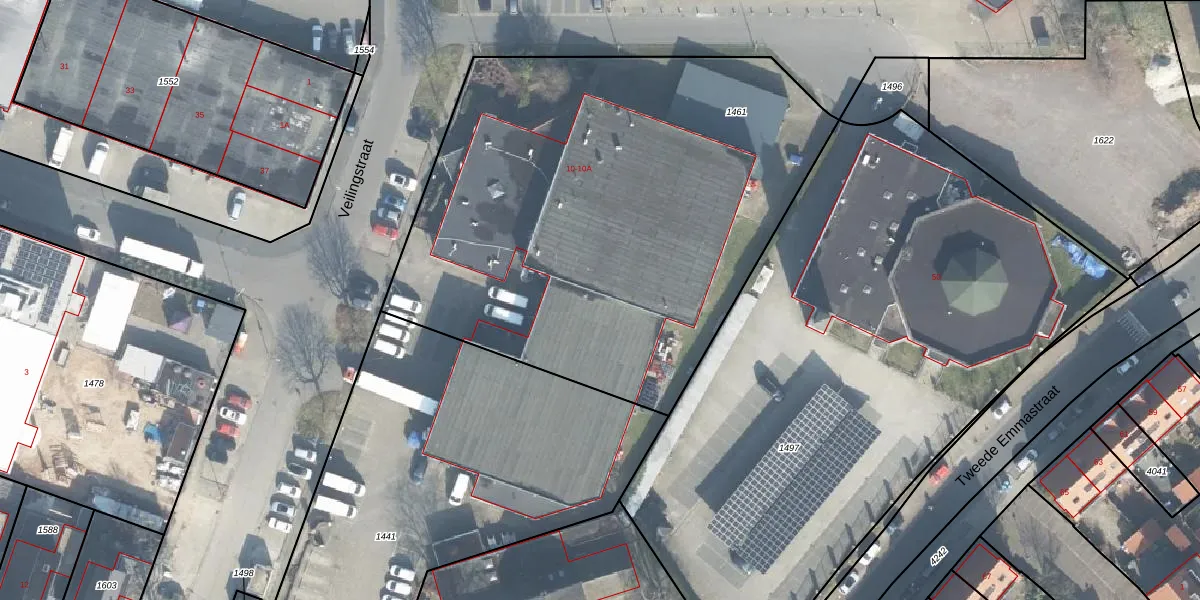 Het perceel waarop Veilingstraat 10 staat heeft een oppervlakte van 3055 m². Dit is een zeer groot perceel. De perceeloppervlakte wordt geregistreerd door het Kadaster. Gedetailleerde informatie over de maten van dit perceel kunt u vinden in het rapport Kadastrale kaart met maatvoering van Veilingstraat 10.