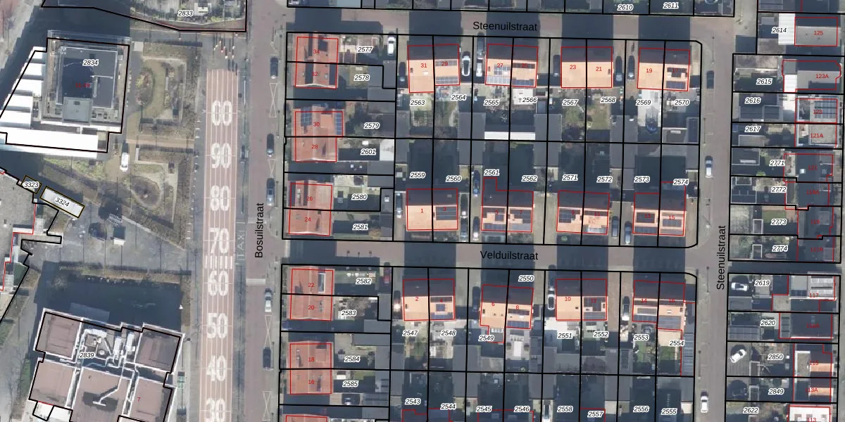 Het perceel waarop Velduilstraat 1 staat heeft een oppervlakte van 223 m². Dit is een middelgroot perceel. De perceeloppervlakte wordt geregistreerd door het Kadaster. Gedetailleerde informatie over de maten van dit perceel kunt u vinden in het rapport Kadastrale kaart met maatvoering van Velduilstraat 1.