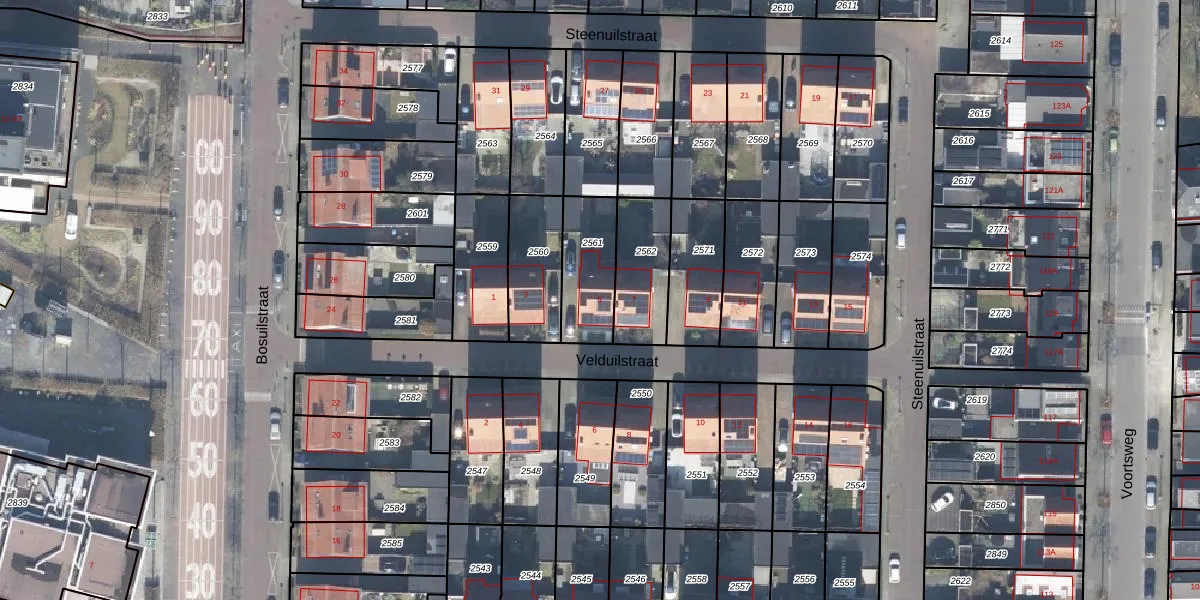 Gebruik de zoekbalk of klik op een perceel voor informatie over de adressen binnen dit perceel.