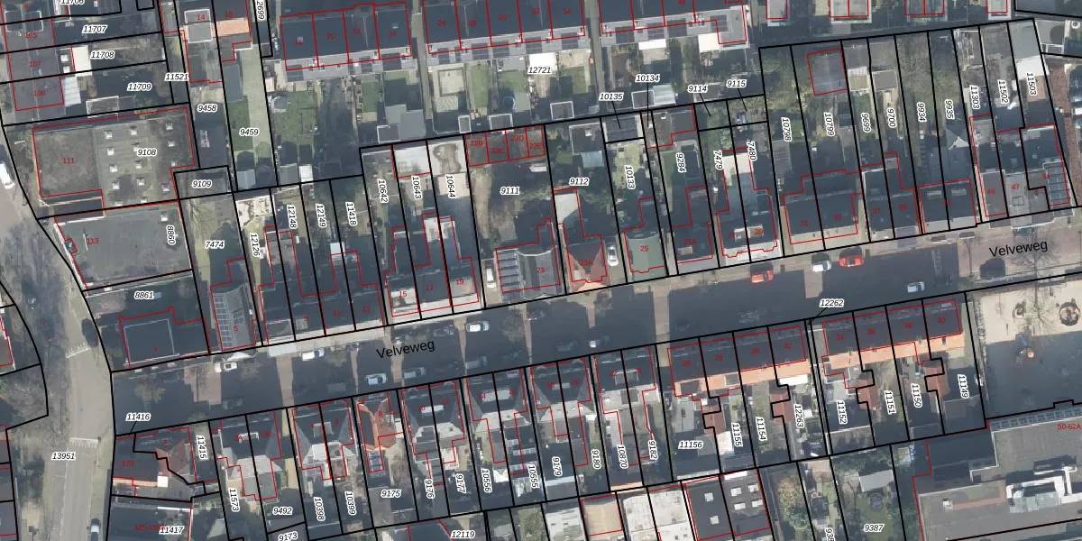 Het perceel waarop Velveweg 23 staat heeft een oppervlakte van 480 m². Dit is een groot perceel. De perceeloppervlakte wordt geregistreerd door het Kadaster. Gedetailleerde informatie over de maten van dit perceel kunt u vinden in het rapport Kadastrale kaart met maatvoering van Velveweg 23.