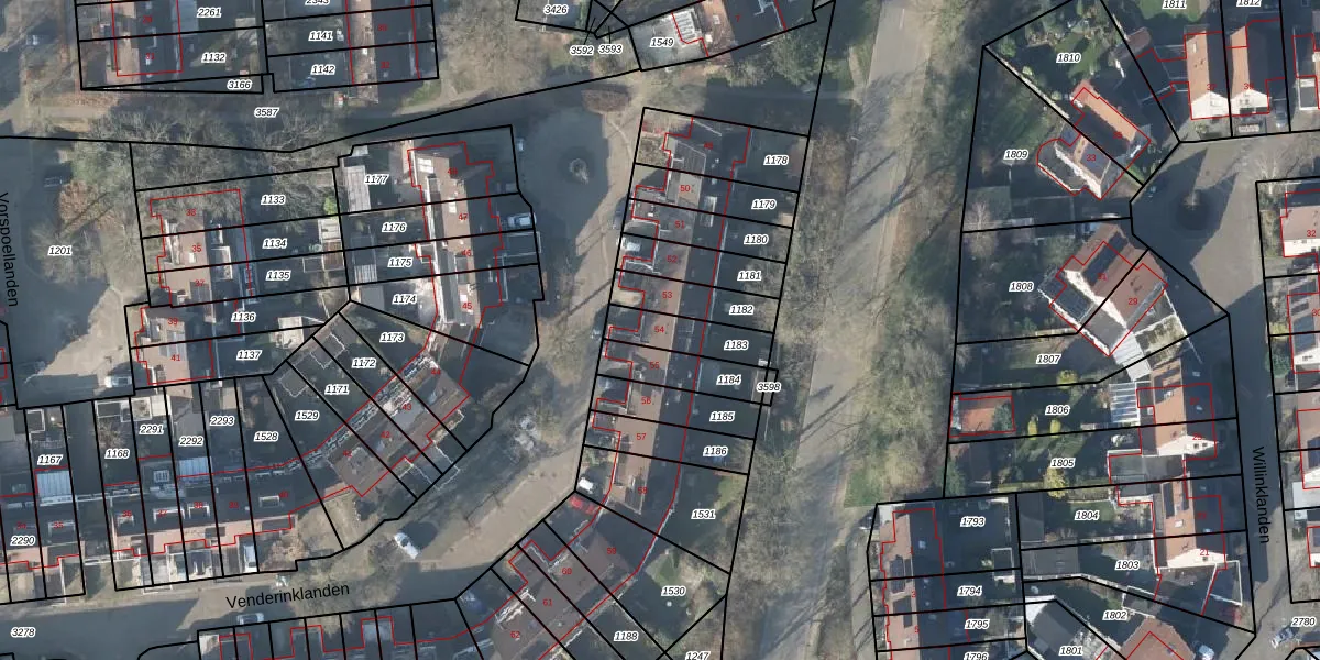 Venderinklanden 54 is gelegen op kadastraal perceel LNK00P1183. Deze kadastrale aanduiding is uniek en wordt gebruikt door het Kadaster om eigendomsrechten en andere zakelijke rechten vast te leggen. Het perceel maakt onderdeel uit van de kadastrale gemeente Lonneker.